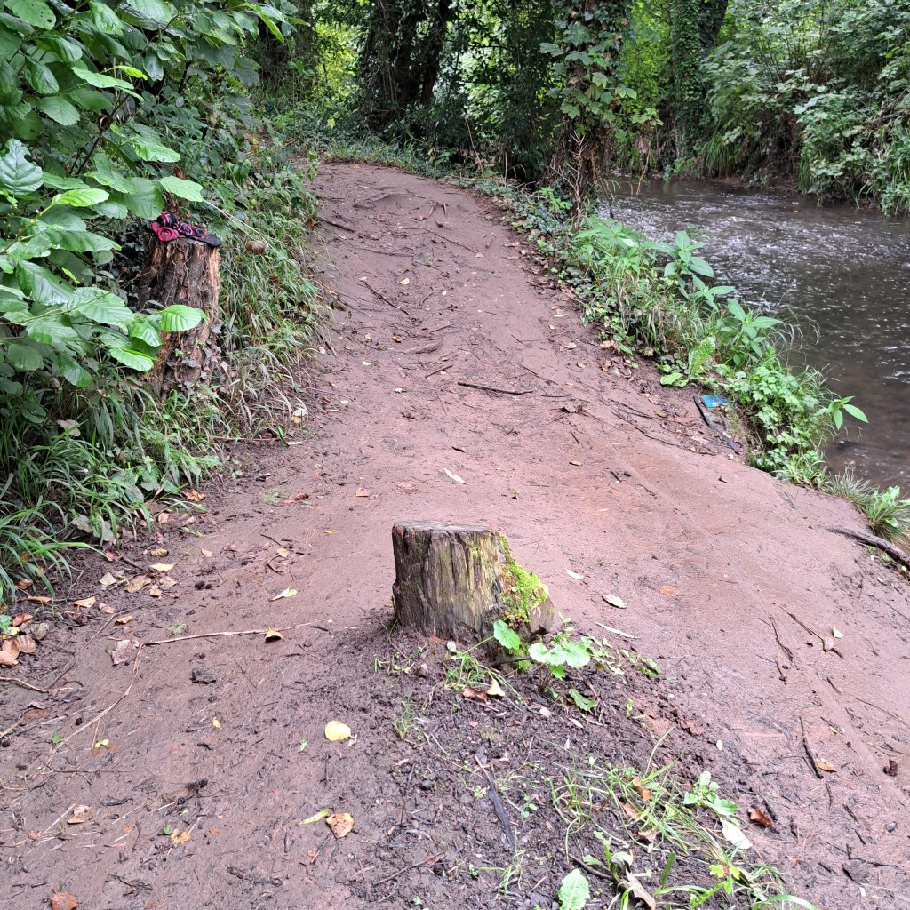 Woodland footpath alongside river.